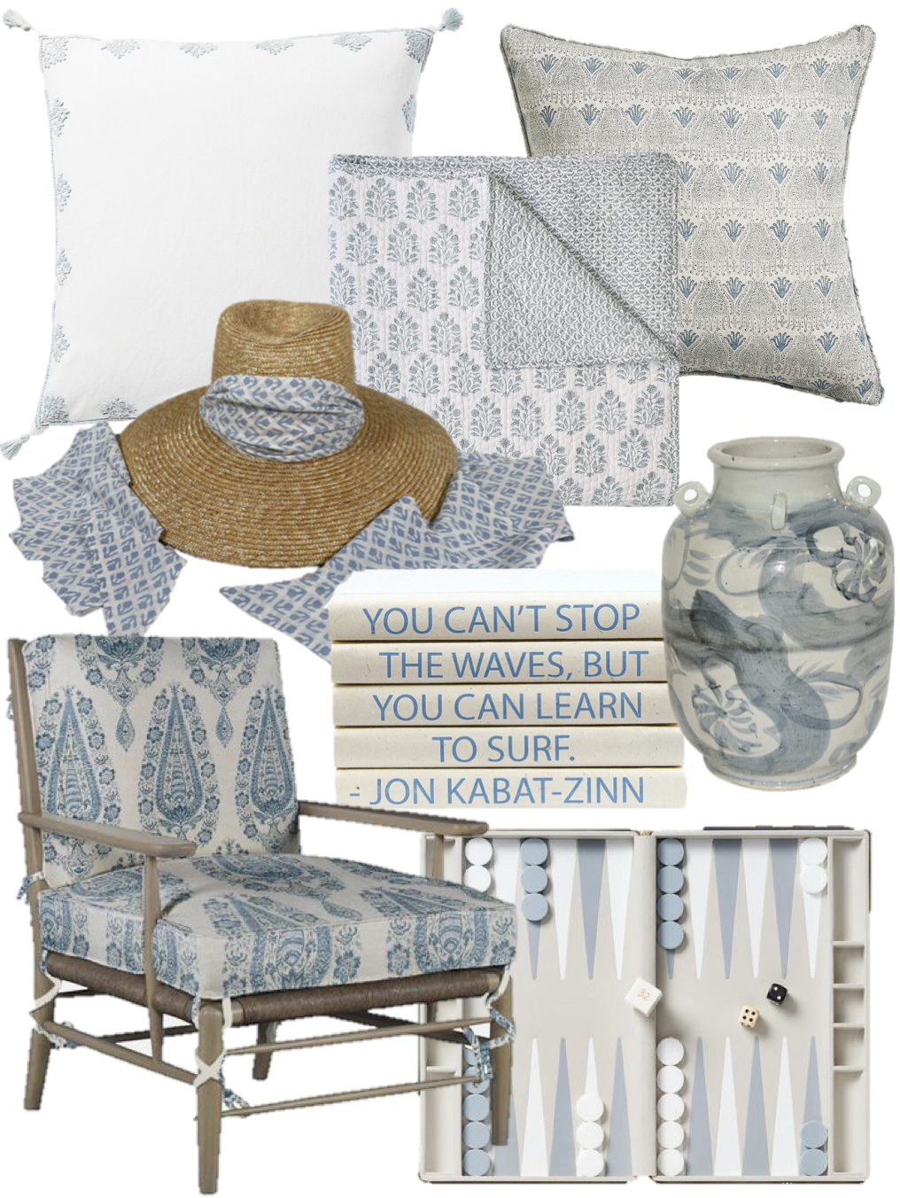 Embroidered Pillow | Block Print Blanket | Block Print Pillow | Sunhat | Books | Vase | Chair | Board Game