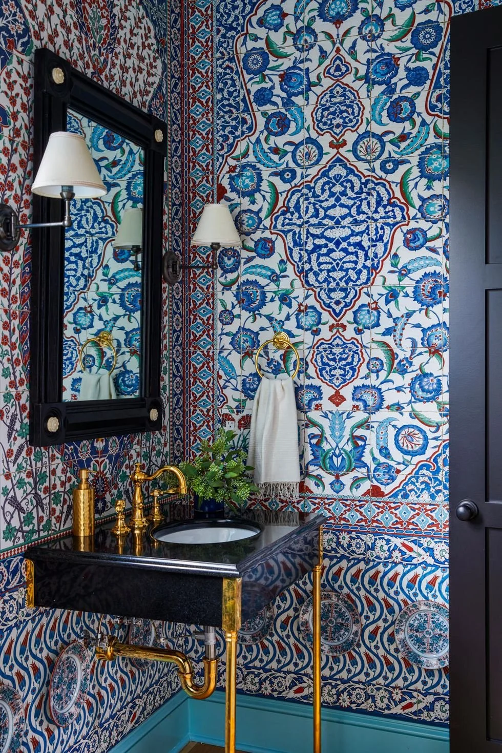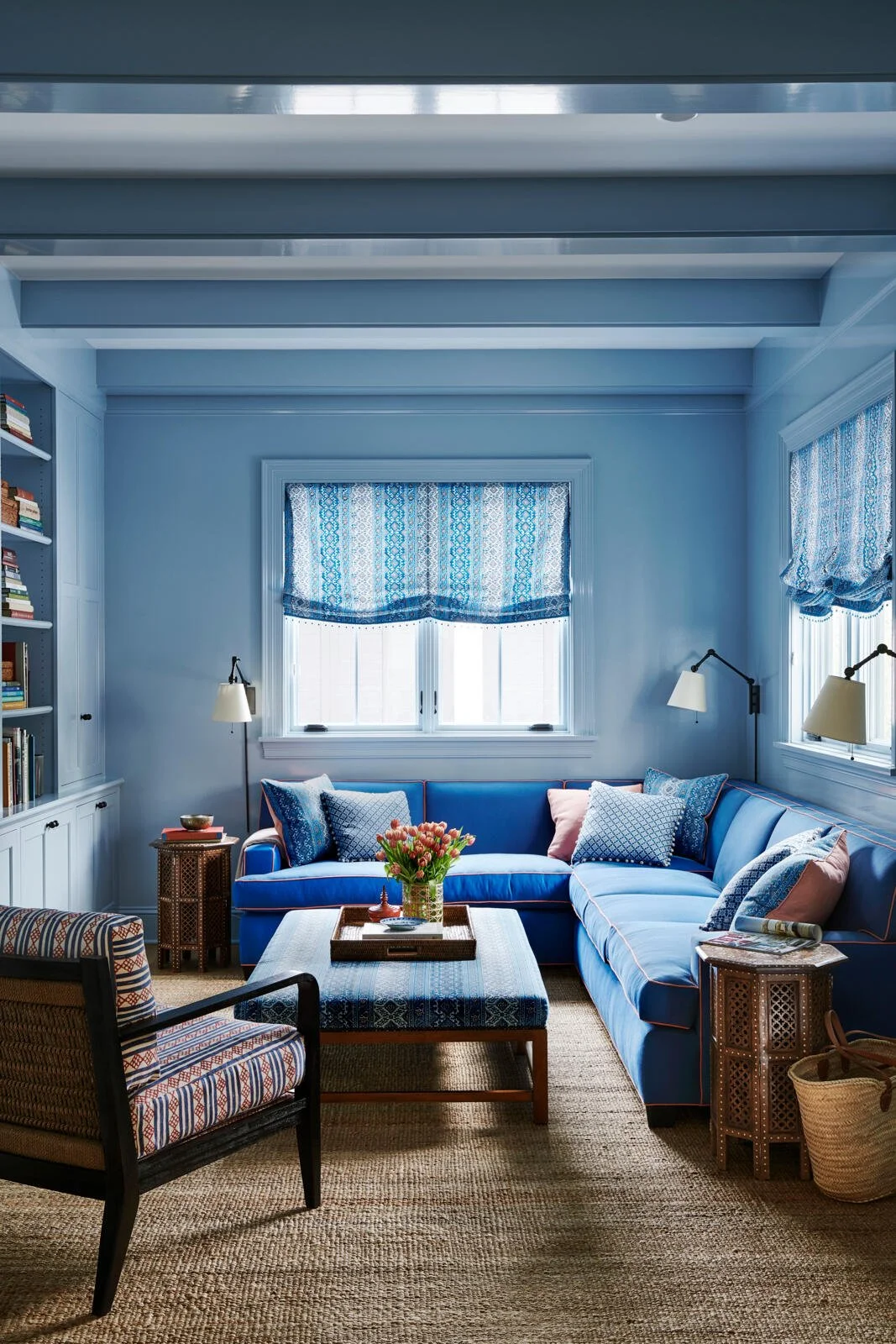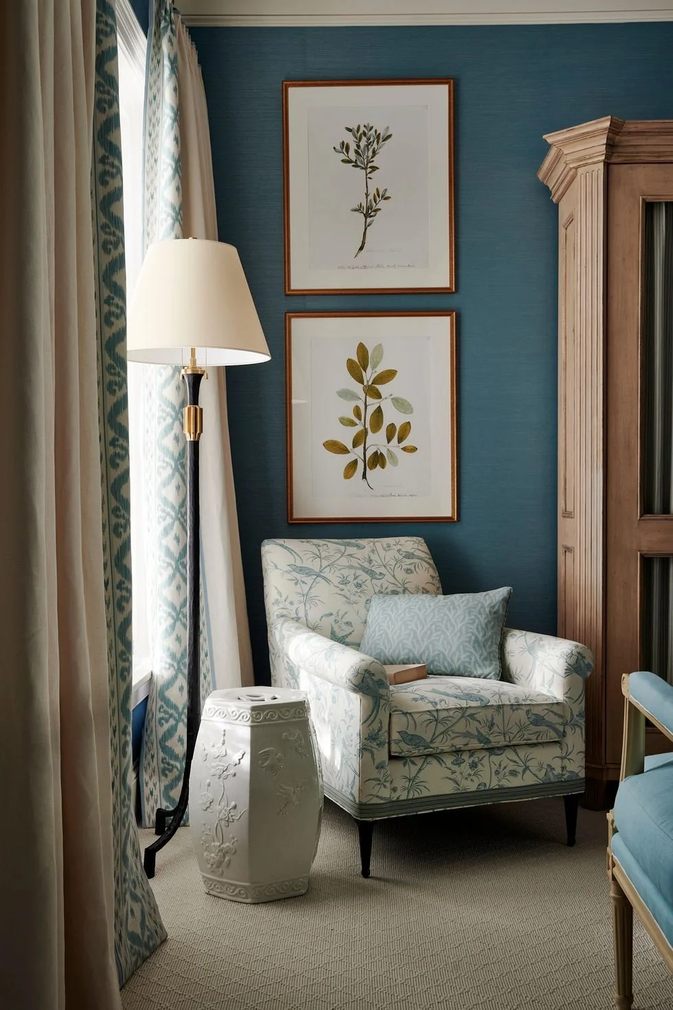 Tour a stunning home designed by Mark D Sikes, inspired by Imari Porcelain. The home was recently featured in House Beautiful - you can read the article here! My favorite room in the house is this stunning sitting room (above), the walls adorned by Gracie wallpaper and Visual Comfort & Co. Sconces.